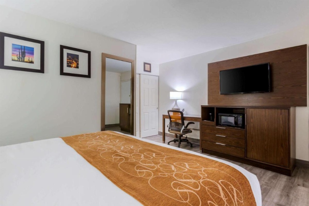 Room features a 32-inch HDTV, a fridge, a microwave, and tea and coffee-making facilities.